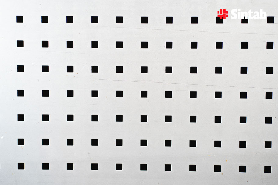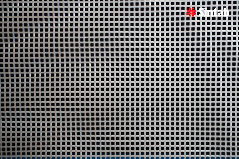 Perforerad plåt med kvadratiska hål ger ett distinkt och regelbundet mönster med tydlig geometrisk karaktär. Hålen placeras i raka rader, vilket skapar ett symmetriskt och strukturerat uttryck.